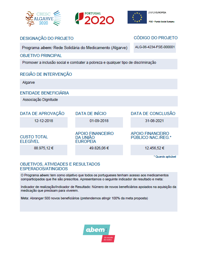 O website do Programa abem: Rede Solidária do Medicamento recorre a cookies para melhorar os serviços prestados aos utilizadores. Ao clicar no botão ao lado, ou ao continuar com a utilização deste website, consente na utilização de cookies, nos termos da Política de Cookies do Programa abem.